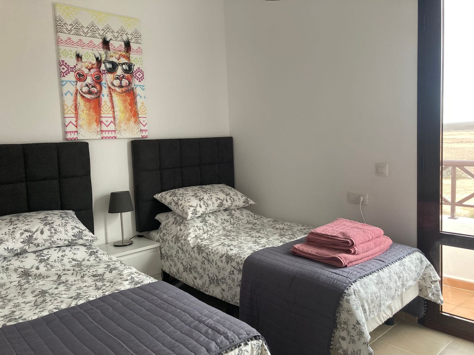 Upstairs there is a double bedroom with direct access to large terrace that over looks the garden, pool and volcano in the national park. The second bedroom has 2 single beds and direct access to a small balcony again over looking the pool and national park.